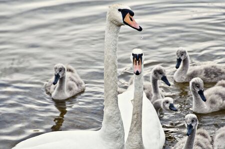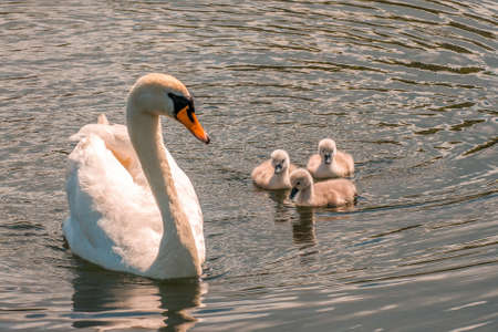Swan family, mother with her chicks, swimming on the river Moselle in Germany, water birds