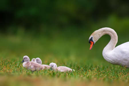 Swan family, mother swimming and six baby swans standing in the green grass by the water