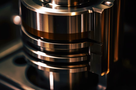 A close-up view of a precision engineering component, showcasing intricate metal textures and detailing, ideal for industrial and manufacturing contexts.