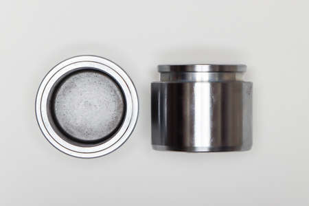 Caliper repair kit, two metal pistons - plungers. Set of spare parts for car brake repair. Details on white background, copy space available. UHD 4K.