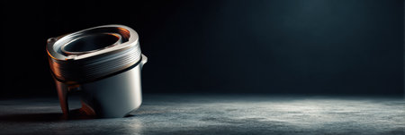 Metallic engine piston sits elegantly with a shiny surface in a darkened setting, highlighting its engineering details and craftsmanship.