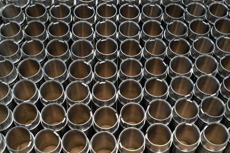 Metallic gray cylinders forming a uniform abstract pattern with industrial style.