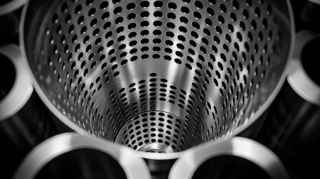 A futuristic industrial heat exchanger with polished metallic details, bolts, and mechanical components in a high-tech setting.