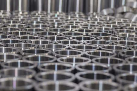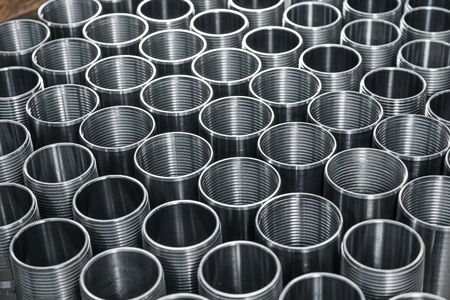 Steel threaded circular sleeve bearings put closely together. Close up.