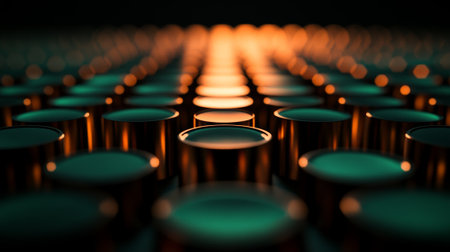 Abstract Cylinder Grid. A grid of metallic cylinders with a warm, glowing light source in the background.