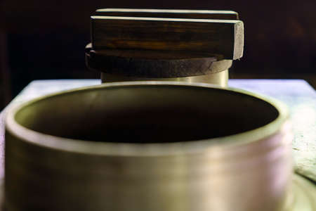 Heavy industry steel cylinder, piston with industrial plans. Blue tone.