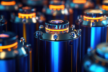 Modern energy cells glow with bright lights in a close-up view, showing advanced technology and design.