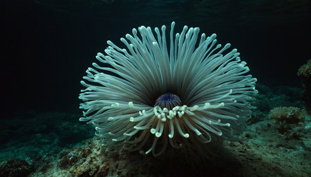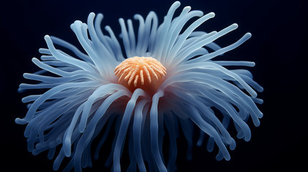 An image showcases a sea anemone in a close-up view against a dark backdrop. The aquatic plant is characterized by a translucent, radial arrangement of tentacles, exhibiting a range of blue and white hues. The composition may be suitable for scientific illustrations, educational resources, or artistic designs.