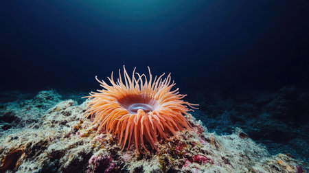 Top view of a sea anemone in its natural habitat, with a wide-open space on the right side for adding text or branding.