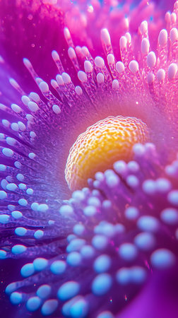 Abstract close-up captures the enchanting beauty of a sea anemone flower, focusing on its intricate details, vibrant colors, and captivating depth. The textured center is yellow.