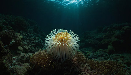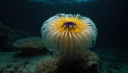 A fluorescent sea anemone in the depths of the sea. Ai generative