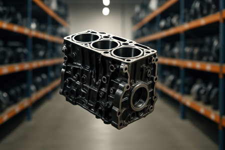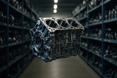 Glossy metallic car engine block, a crucial component for automotive repair and manufacturing, floating against a blurred background of a parts warehouse, symbolizing inventory and supply chain efficiency.