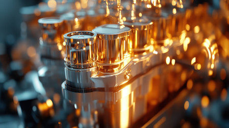 This image captures a close-up view of engine components featuring shiny chrome surfaces illuminated by glowing orange light. Ideal for automotive design inspiration.