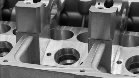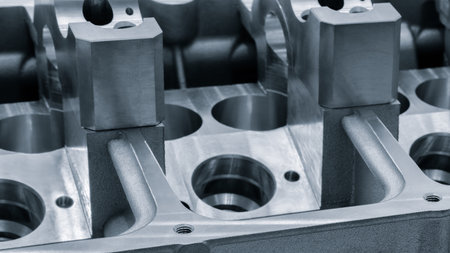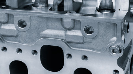 A detailed close-up view of an engine cylinder head component showcasing intricate metalwork and precision machining in an industrial environment.