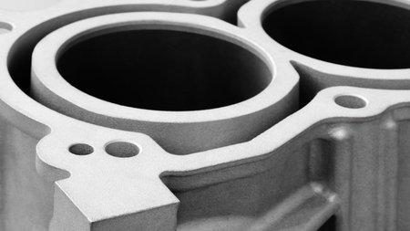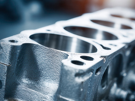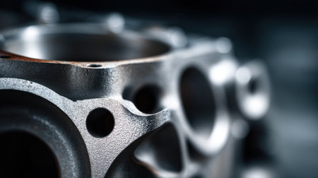 A detailed view of a steel engine core reveals gleaming cylindrical surfaces alongside rugged, textured molds, set against an industrial workshop backdrop.