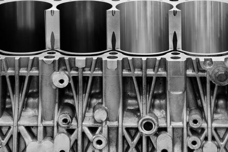 Close-up of engine cylinder block undergoing service repair, industrial service repair concept background blue tone