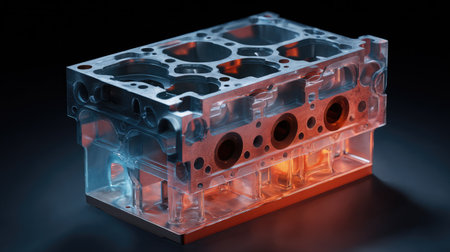 This image features a transparent engine block model showcasing intricate internal structures and components, ideal for automotive education and promotional materials.
