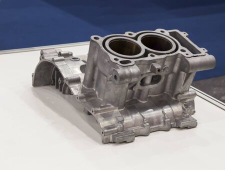 Close-up of the cylinder block in the light blue scene.Automotive part,machine part .