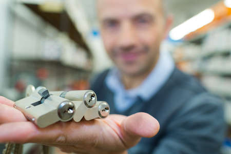 Exhibition of pirated copies of fishing metal spoon baits. Bait for fishing in the shape of a spoon with a hook on a white background. 03/09/2017 Zhitomir.