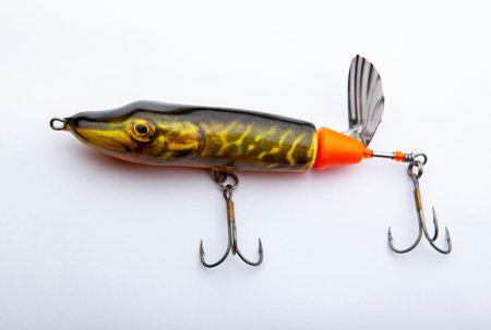 An artificial fish, used as bait by anglers on a white background. With space for text.