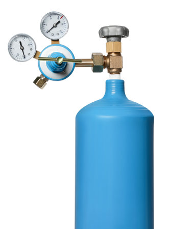 Gas new metal cylinders with pressure gauge. Small details are visible. The background is blurred.