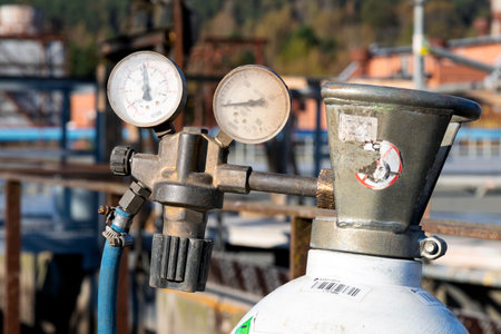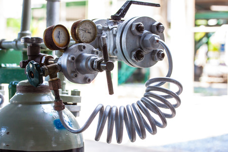 Gauge and valve on top of tanks for welding gas in metal workshop