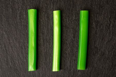 Chopped chives side view on white background upright rings standing in parallel rows for herb garnish ingredient cooking and food styling themes