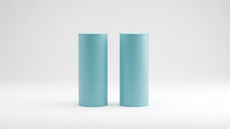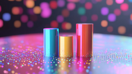 Three colorful cylinders with iridescent surfaces, against a pastel gradient background