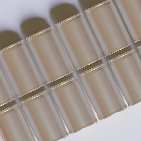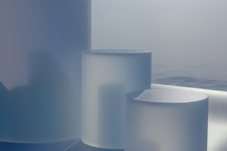 A series of three frosted cylinders sit on a white surface, overlooking a calm ocean with a hazy horizon. The cylinders are backlit, casting a soft, ethereal glow.