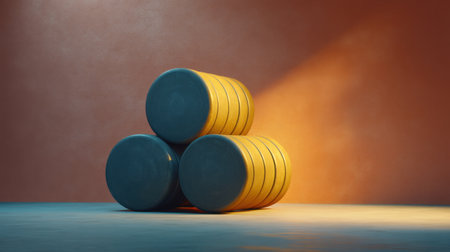 A striking arrangement of three bright yellow cylinders stacked on a blue surface. The warm lighting casts a soft glow, enhancing the vibrant colors against an orange wall.
