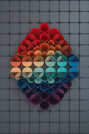 A vibrant and colorful artwork featuring a diamond-shaped composition of rainbow-colored circles arranged on a gray grid background.