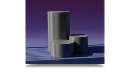 Three smooth matte cylinders arranged in varying heights with a soft gradient from beige to light gray tones set against a plain light background. The feature subtle shading and a clean...
