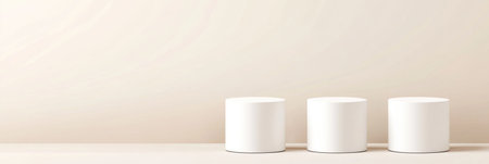 Abstract white cylindrical pedestals set on a beige background for product presentation with copy space, in a minimalist style. --ar 3:1 --v 6.1 Job ID: 421b80b9-b893-4671-9d84-8f91edfe5c3f