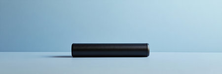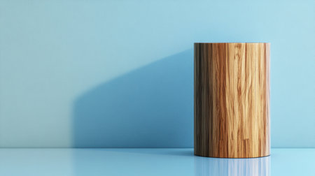 A minimalist wooden cylinder stands on a polished surface against a soft blue wall, showcasing natural textures and shadows, ideal for interior design inspiration.