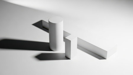 Minimalist composition featuring abstract geometric forms bathed in dramatic light and shadow. This striking visual explores the interplay of shapes, lines, and negative space, creating a sophisticated and modern aesthetic.
