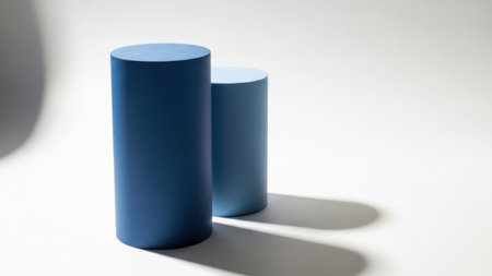 Two blue podiums on a white background with hard shadows. Shallow depth of field.