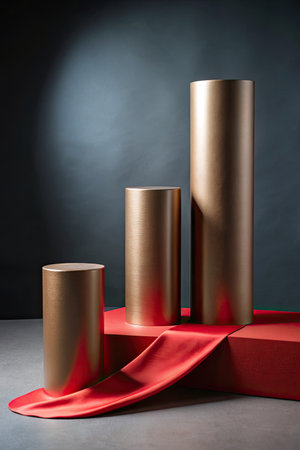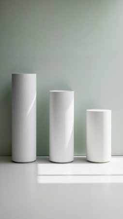 White cylindrical pedestals arranged in ascending height. Product display, retail presentation, gallery exhibition, or modern interior design visualization concepts.