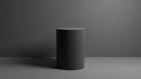 A dark, cylindrical pedestal stands centered on a textured gray surface against a plain gray wall, creating a minimalist and modern aesthetic.
