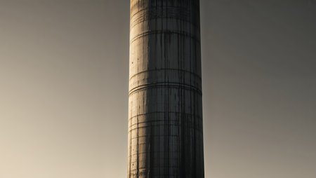 AI Generated. A conceptual image of a large industrial column standing alone in the middle of the frame with the sun casting a shadow