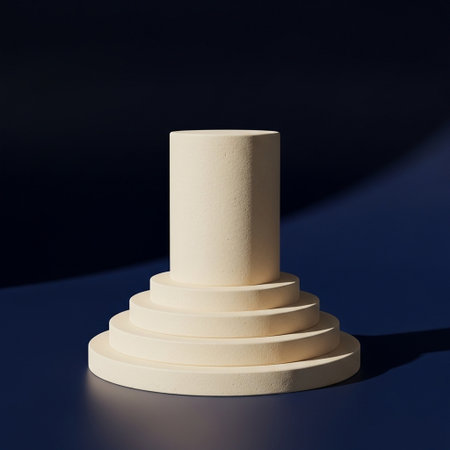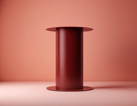 A smooth terracotta cylindrical pedestal is centered in a softly lit space, with subtle shadows and a warm, neutral background.