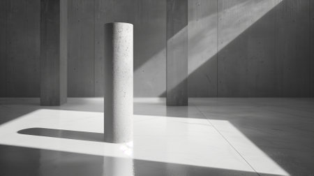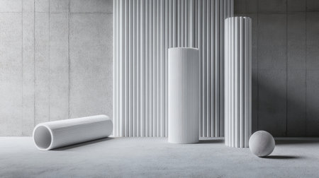 This captivating minimalist interior showcases white textured cylinders and a sphere against a concrete backdrop, highlighting modern architectural design and simplicity.