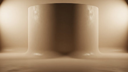A large, smooth, cylindrical object stands in the center of a sepia-toned studio environment. Dramatic lighting emanates from the sides, casting soft shadows and highlighting the curved surfaces of the object and the misty floor. The overall effect is atmospheric and slightly surreal.