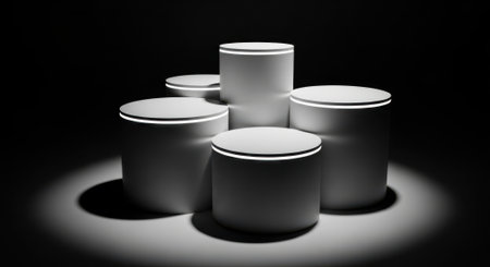 Several white cylindrical containers with lids are artfully arranged, illuminated by a dramatic spotlight creating striking shadows on a dark surface.