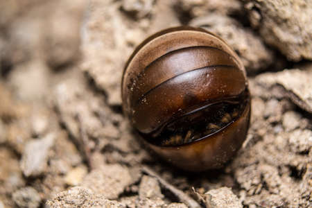 Millipede curled up on the ground in sun shine morning