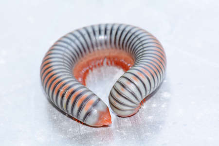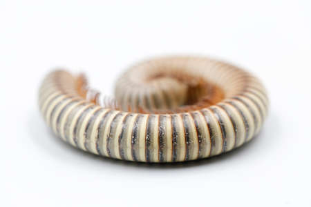close-up of millipede with many legs curled up on white background. This millipede was staff since 2017 and found in forest Chiang Mai, Thailand.