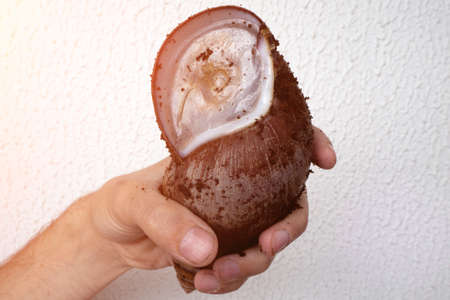 Close up of hibernating Achatina snail in man hand. The snail hibernated due to unfavorable living conditions. energy saving