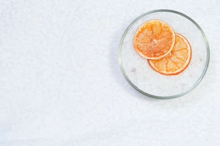 Bath salt in bowl and dried orange slices on the towel. Overhead view