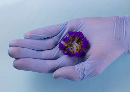 Hand in a blue medical glove holds a blue flower in the palm on a blue background.