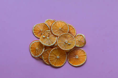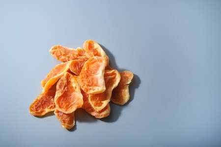 group or heap pile of dried tangerines on light blue background, healthy dried fruits snack for vegans and vegetarians