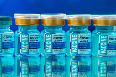 Corona virus and Covid - 19 new vaccine in ampules, different color variations of vaccine on the blue background